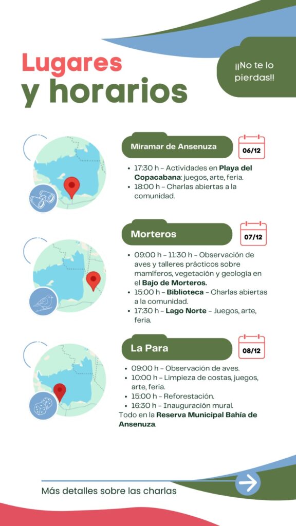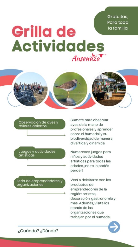 Con actividades para toda la familia y amantes de la naturaleza, se brindarán actividades al aire libre en las 3 localidades, con juegos, premios, sorteos y charlas sobre diferentes temáticas relacionadas al humedal y su conservación, con invitados internacionales y nacionales. Una oportunidad nueva y única de conocer más de Ansenuza.