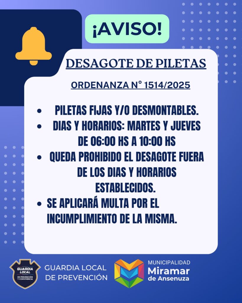 LOCALES ¡AVISO! Importante en Miramar para el Desagotes de Piletas 17 horas ago Radio Ansenuza Spread the love Continue Reading Previous INFO Recolección de Residuos para la temporada en Miramar de AnsenuzaNext ATENCIÓN !!! BALNEARIA REPROGRAMO EL ENCENDIDO DEL ARBOLITO DE NAVIDAD