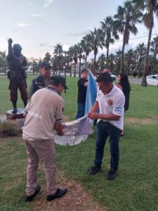 Antes de proceder a la ofrenda, los familiares de Gerardo colocaron la bandera que él tenía en su casa. En ese momento, el Intendente Cicarelli comunicó a todo el pueblo, a los familiares y a los veteranos que el Ejecutivo enviará un proyecto de ordenanza para que una de las calles de Miramar lleve el nombre de Gerardo Armesto.